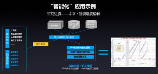 目前應用廣泛的斑馬進度,還是“半手工進度編制”。通過項目具體信息、施工及人員組織策劃、施工工藝策劃等在斑馬網(wǎng)絡計劃軟件中半自動計劃,確定邏輯關系,估算時間等;通過工程量在廣聯(lián)達BIM 5D中實現(xiàn)WBS分解&定義活動;最終形成“30%內(nèi)容自動提供,70%內(nèi)容手工處理”的半自動搭積木進度編制。而未來,將實現(xiàn)“智能化進度編制”。當公司積累到足夠多的數(shù)據(jù),在云服務中已存在企業(yè)自身的各種計劃模板時,只需輸入條件進行自動匹配,就可以快速生成時間短、用工少、成本低的最優(yōu)計劃方案,從而提高勞動力、機械設備等應用的有效性。這就是“數(shù)字建筑”之“智能化”的一大縮影。