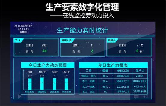 其二,在線監(jiān)控勞動力投入。應用“智能安全帽”,可以實現(xiàn)施工人員的精準定位,隨時跟蹤個人情況。如早晨上班時,實時統(tǒng)計工人進場,自動進行生產(chǎn)能力轉化,與當天生產(chǎn)需求匹配,工人進場完成后勞動力不足則會自動預警。