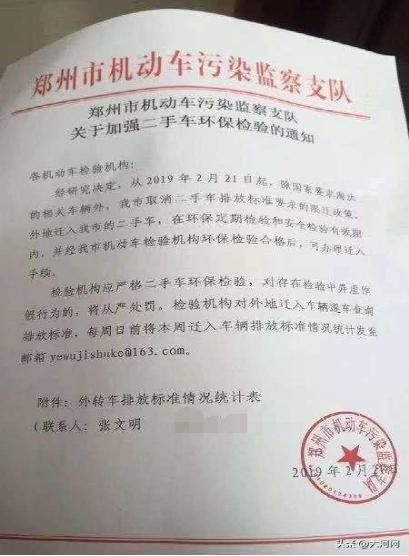 河南商報記者了解到,鄭州市機動車污染監(jiān)察支隊于2月21日發(fā)出了《鄭州市機動車污染監(jiān)察支隊關(guān)于加強二手車環(huán)保檢驗的通知》。通知稱,“從2019年2月21日起,除國家要求淘汰的相關(guān)車輛外,我市取消二手車排放標準要求的限遷政策,外地遷入我市的二手車,在環(huán)保定期檢驗和安全檢驗有效期內(nèi),并經(jīng)我市機動車檢驗機構(gòu)環(huán)保檢驗合格后,可辦理遷入手續(xù)。”