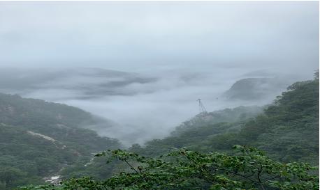 此次旅程一開始就充滿了緊張刺激,蜿蜒的山路盤旋而上,坐在上山的大巴車上宛如坐過山車。一路上群山環(huán)繞,既是“蒨首見龍游,群山翠浪流”,也是冷疊群山闊,清涵萬象殊。