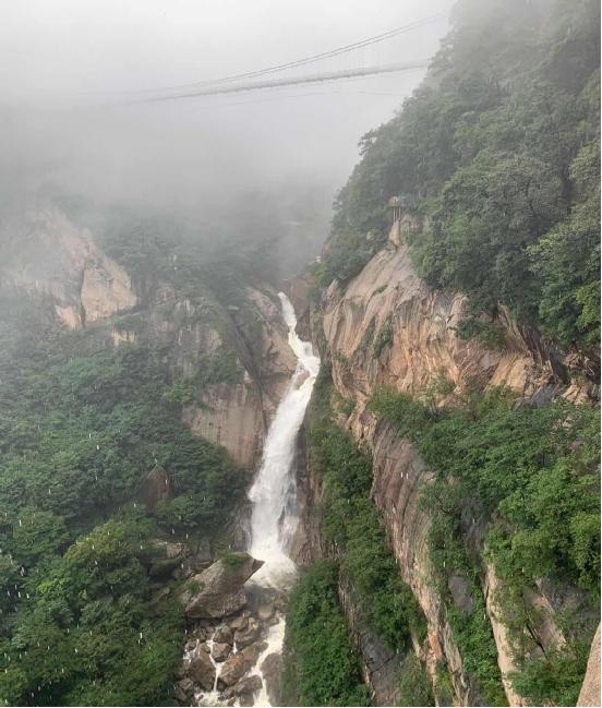 第一站到達(dá)的是九龍瀑布。幽靜的河灣、幽深的碧潭、險絕的峽谷、奔瀉的瀑布構(gòu)成了壯麗的峽谷奇觀。從山上從山上拾級而下,只覺得白云山不是云最多,而是樹,森林覆蓋率達(dá)98%,置身山外看不到巖石,只是全部的綠色。尋瀑的過程輕松愉快,不知疲倦,奈何不知美景尚在下游,前半段路程逗留太久,及到中游發(fā)現(xiàn)小瀑布開始,便驚喜不斷。到了山底,坐上返山纜車道,再一次俯瞰漫山遍野的綠山。那綿綿青山,青峰千疊,莽莽蒼蒼,像一幅潑墨山水畫!這也使得我們更加體會到最美的風(fēng)景需要我們不斷地堅持,不斷地攀登。在工作中亦是如此,只有不斷的堅持和探索,才能提高我們的業(yè)務(wù)能力和專業(yè)知識。