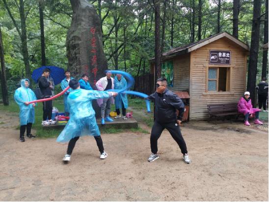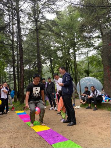 第二站到達(dá)的是森林氧吧。這是以森林、清泉、山石、溪澗、瀑布為基點(diǎn),以高含量的對人體健康極為有益的森林空氣負(fù)氧離子和植物精氣等生態(tài)因子為特色,輔以各類簡約、樸素且與環(huán)境格調(diào)相一致的游憩設(shè)施。于是就在這里做起了團(tuán)建活動。本著友誼第一,比賽第二,消除隔閡、提高團(tuán)隊協(xié)作能力提高凝聚力的宗旨,開展了“帶球大沖關(guān)”、“摸石頭過河”、“蒙眼互打”三項競技活動。